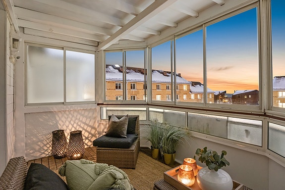 Stilren 2-roms toppleilighet med vestvendt, innglasset balkong på 9 kvm. Oppusset i 2024, bad fra 2021 i regi av brl.